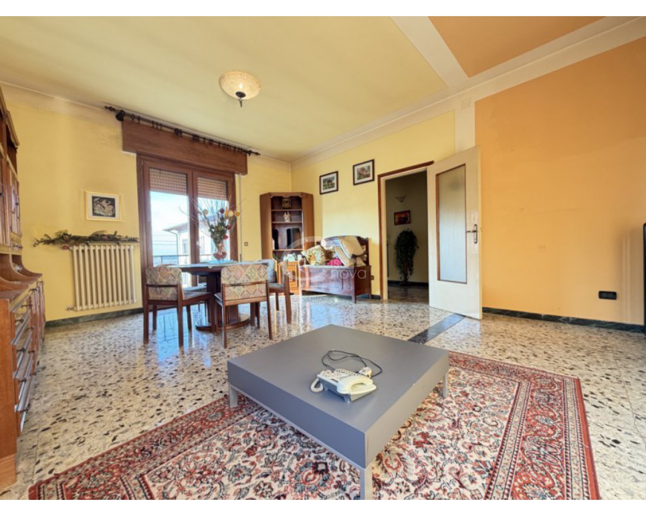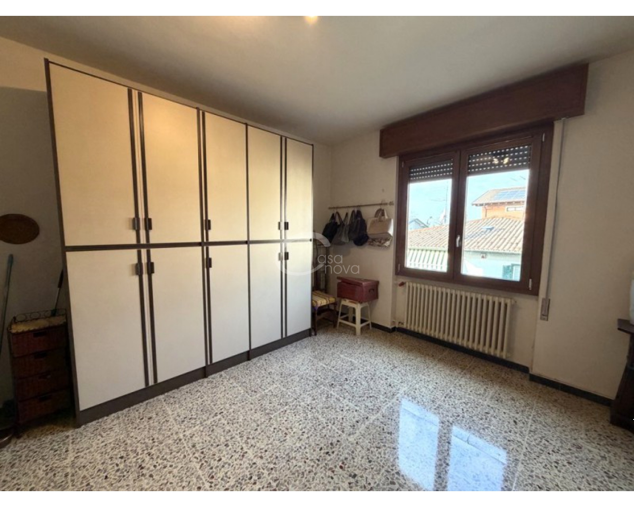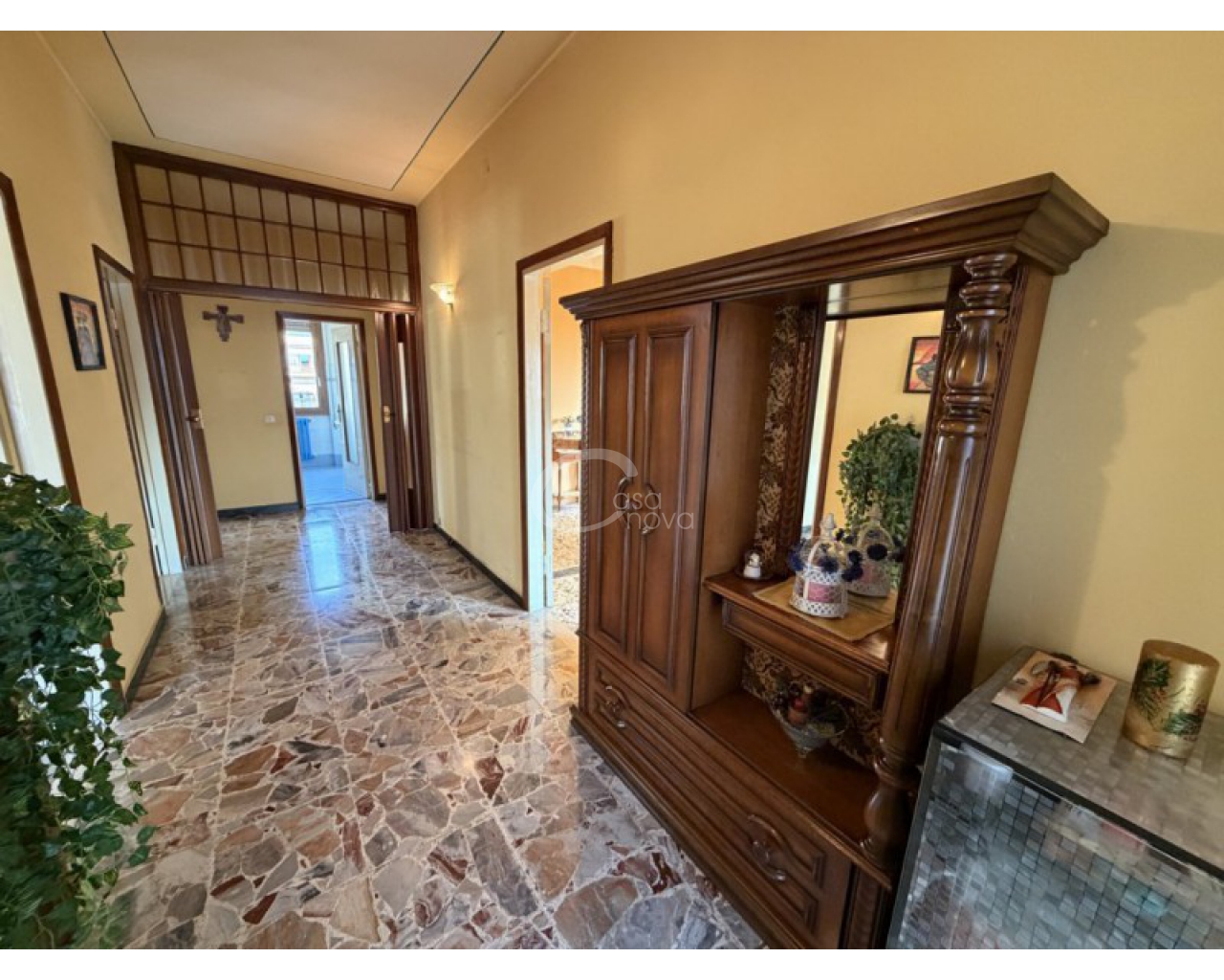 L’abitazione si sviluppa al piano primo ed è accolta da un ampio soggiorno con zona pranzo, con accesso diretto al balcone, perfetto per momenti di relax all’aperto. La cucina è separata e abitabile, anch’essa servita da un secondo balcone, caratteristica che garantisce praticità, luce naturale e una piacevole vivibilità quotidiana. Un comodo disimpegno conduce alla zona notte, composta da una camera matrimoniale, da una seconda camera di generose dimensioni e dal bagno finestrato con doccia.