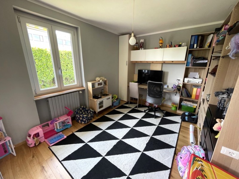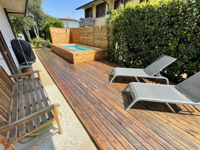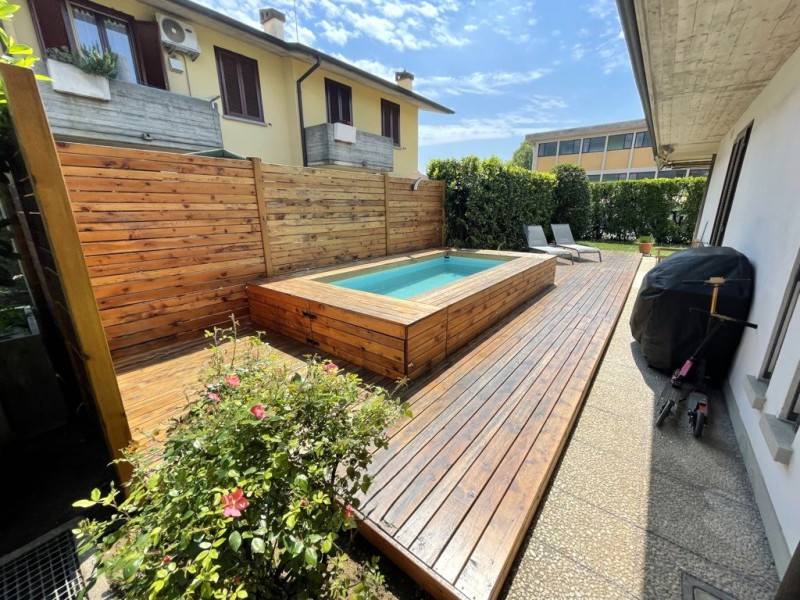 Il giardino esclusivo circonda l’abitazione su tre lati, in parte piastrellato, con la piscina, ideale per fare il bagno d’estate e prendere il sole. Soluzione in perfette condizioni, recentemente ristrutturata internamente.