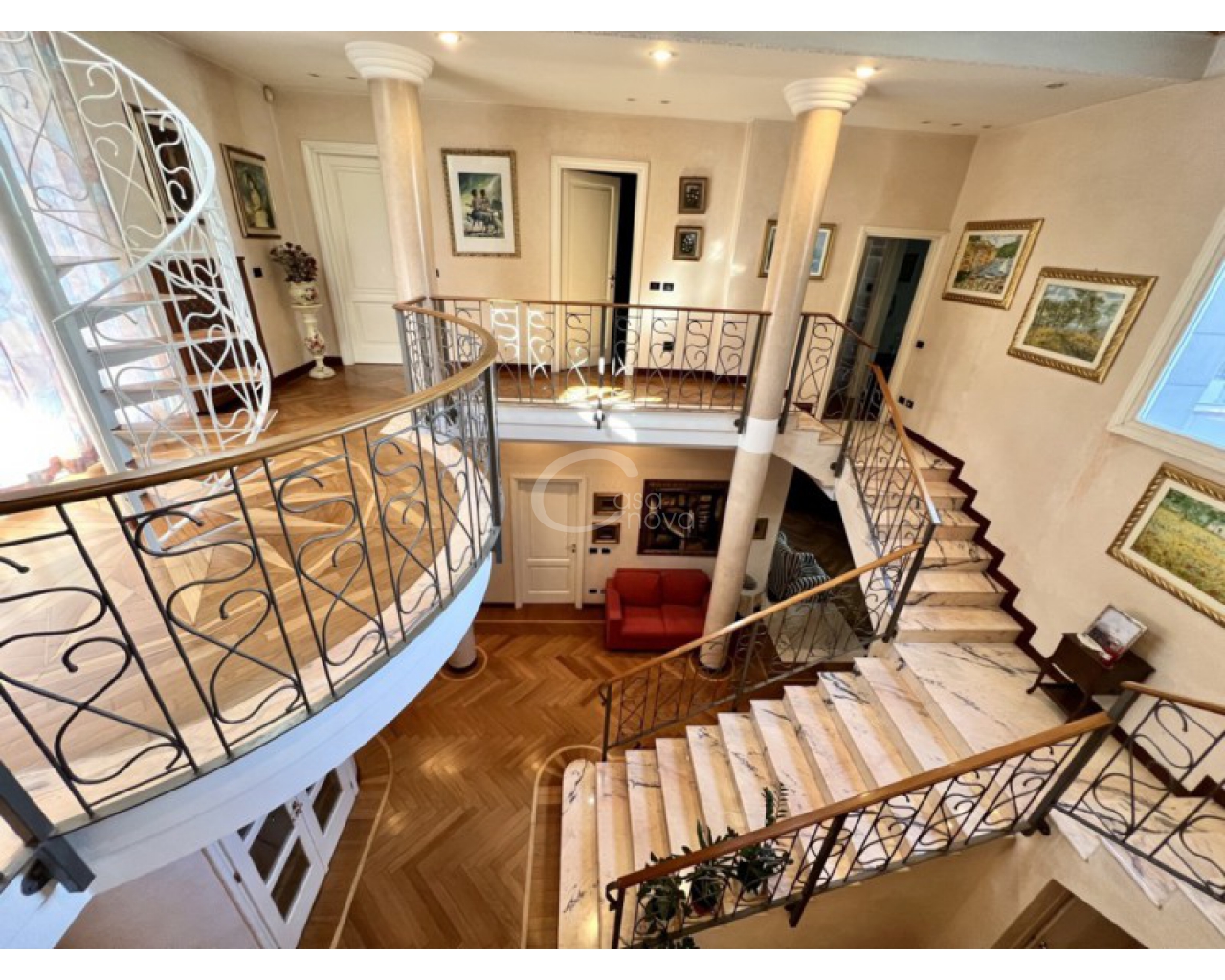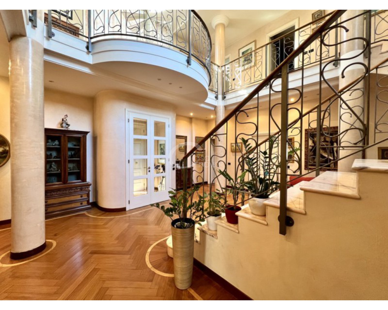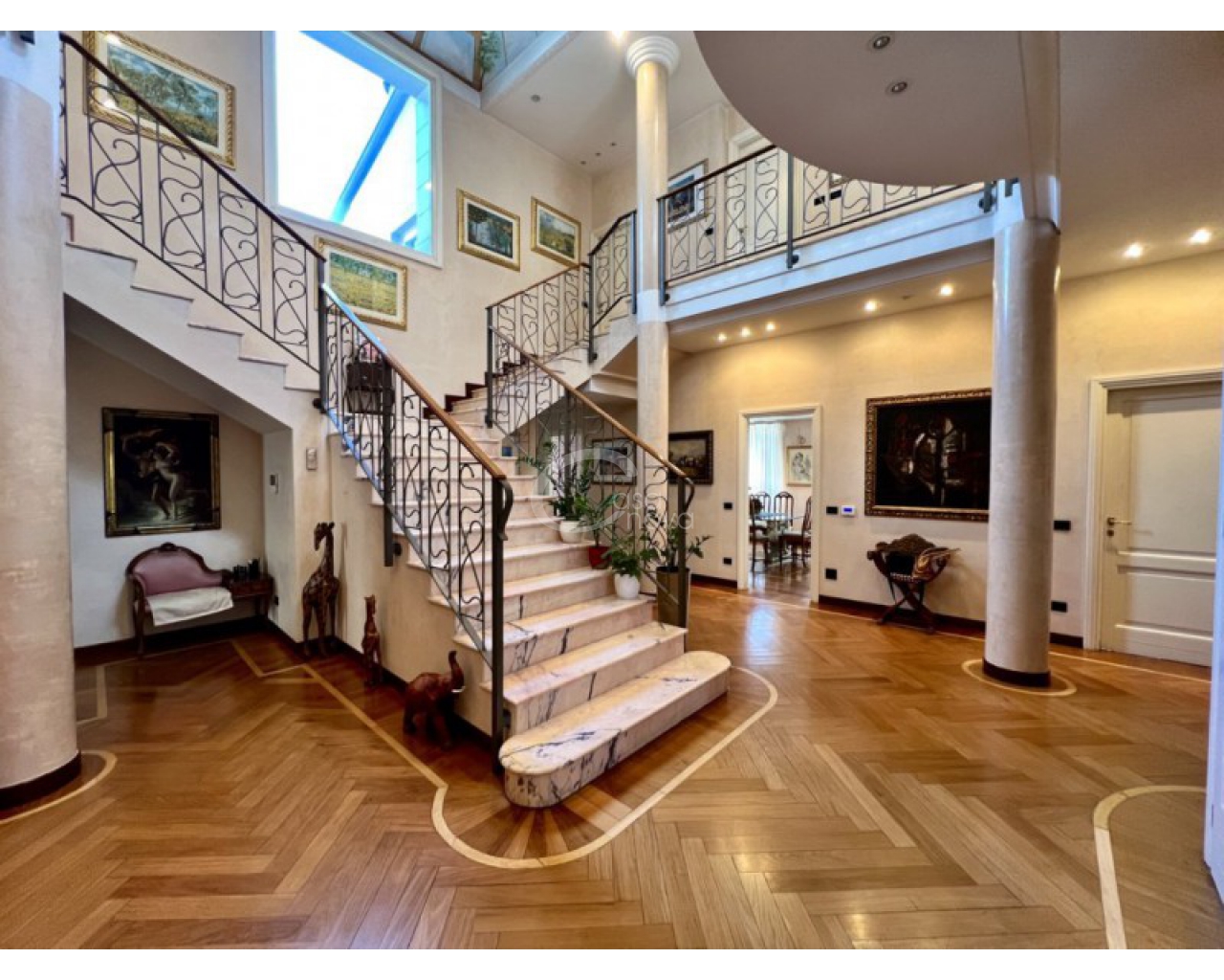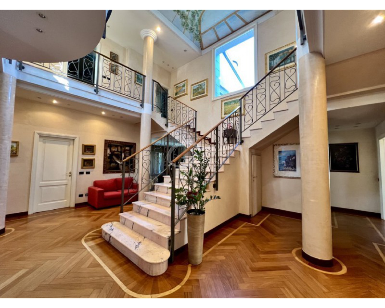 L’ingresso introduce in un suggestivo atrio a doppia altezza, autentico cuore scenografico della casa, valorizzato da una maestosa scala in marmo e ringhiere lavorate, che conduce ai livelli superiori. La luminosità naturale, amplificata dalle ampie vetrate e dal lucernario, esalta le finiture di pregio e il parquet posato a disegno, creando un’atmosfera raffinata e accogliente.