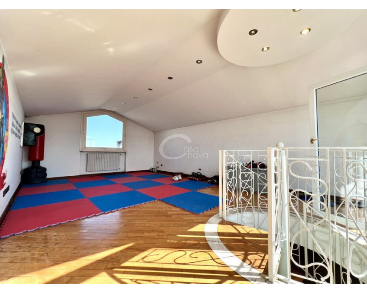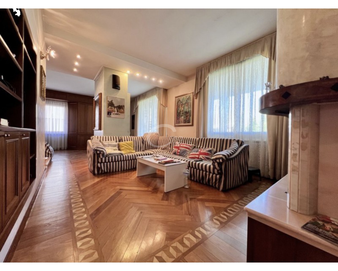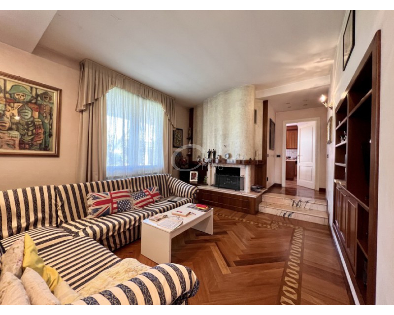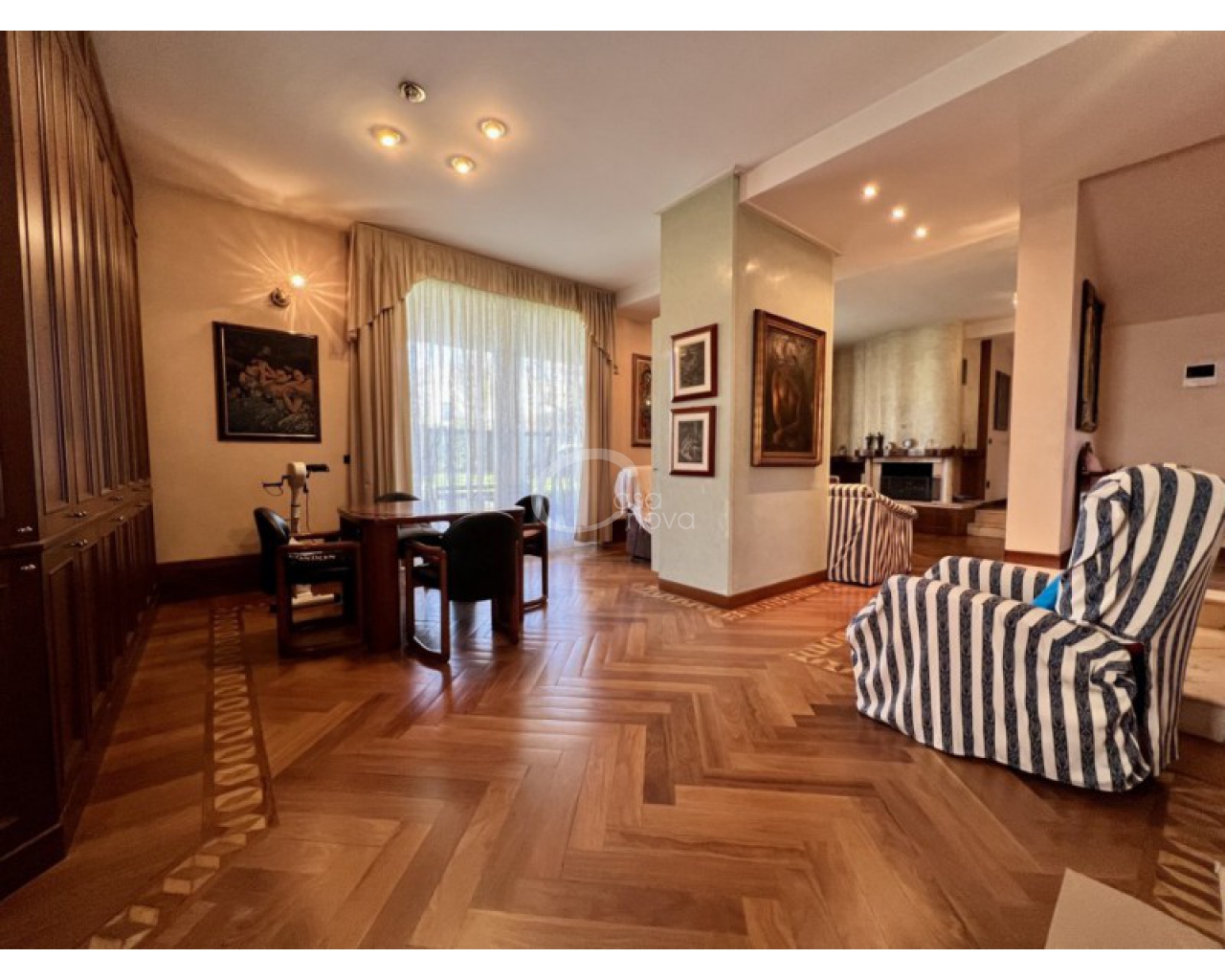 L’ingresso introduce in un suggestivo atrio a doppia altezza, autentico cuore scenografico della casa, valorizzato da una maestosa scala in marmo e ringhiere lavorate, che conduce ai livelli superiori. La luminosità naturale, amplificata dalle ampie vetrate e dal lucernario, esalta le finiture di pregio e il parquet posato a disegno, creando un’atmosfera raffinata e accogliente.