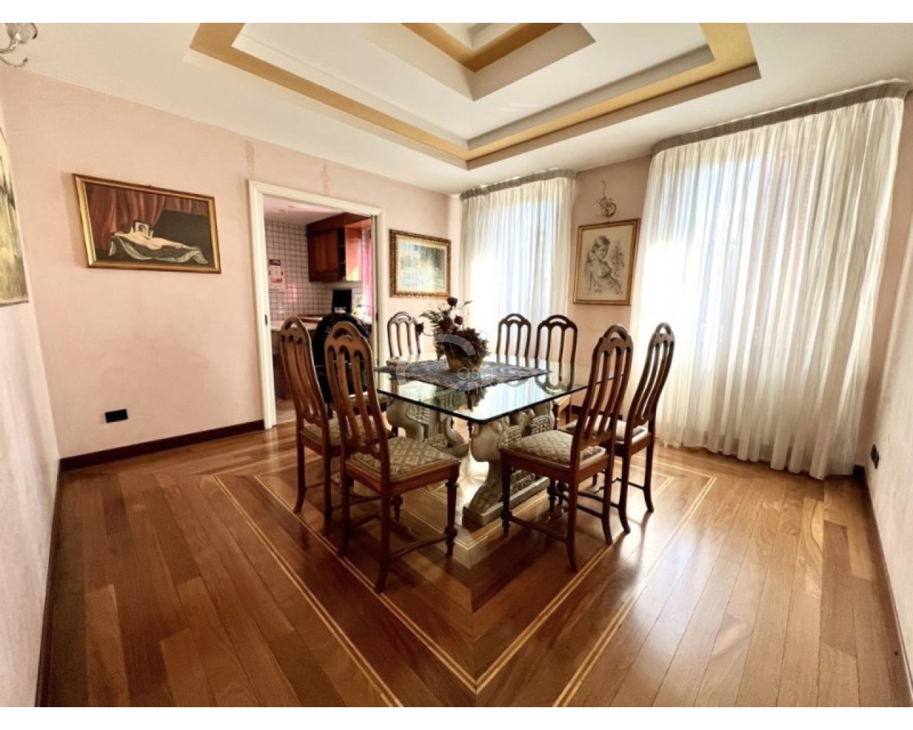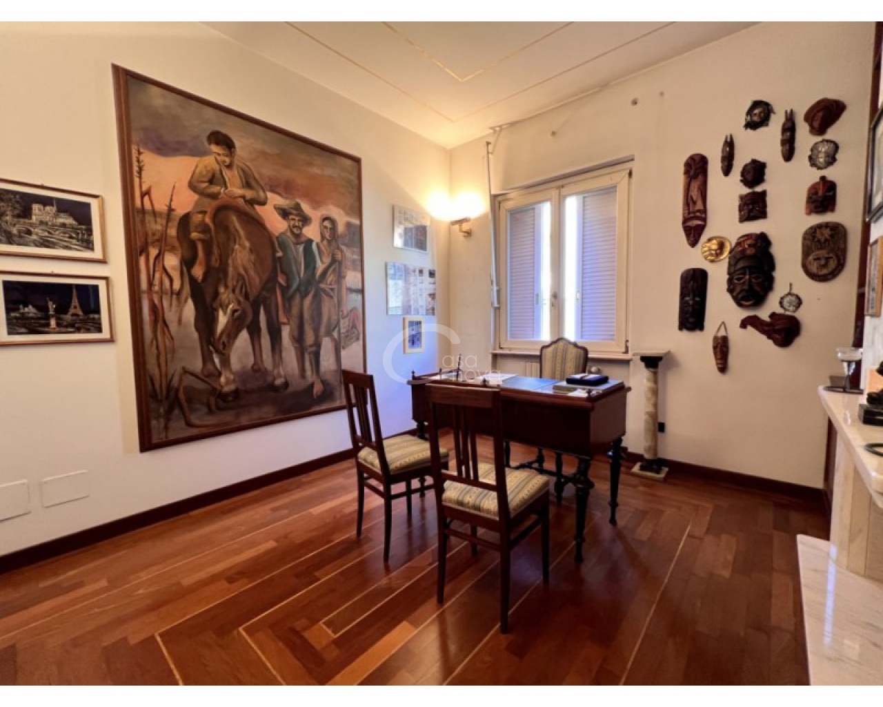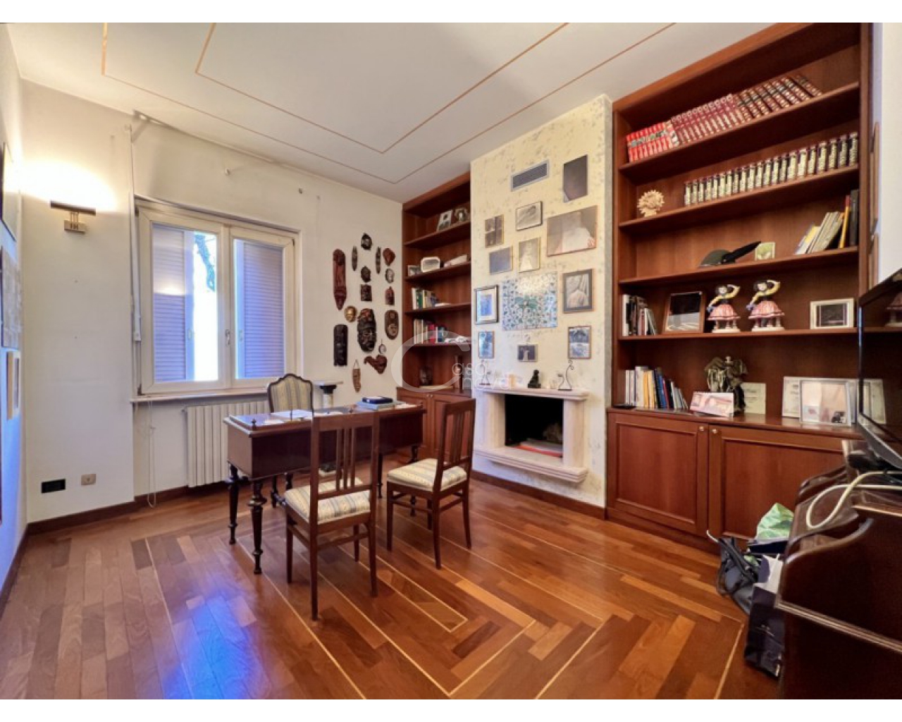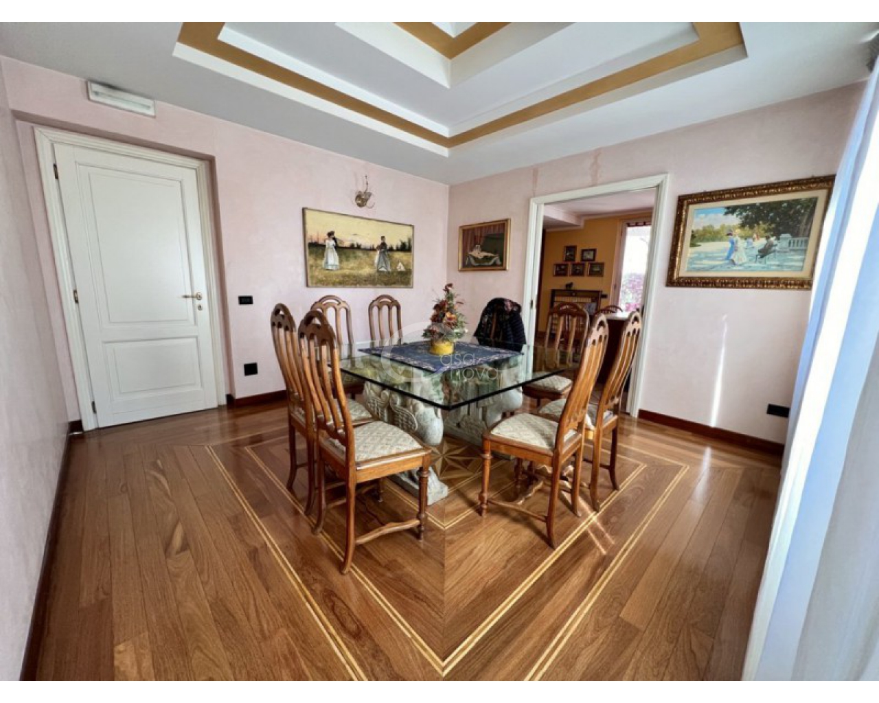 L’ingresso introduce in un suggestivo atrio a doppia altezza, autentico cuore scenografico della casa, valorizzato da una maestosa scala in marmo e ringhiere lavorate, che conduce ai livelli superiori. La luminosità naturale, amplificata dalle ampie vetrate e dal lucernario, esalta le finiture di pregio e il parquet posato a disegno, creando un’atmosfera raffinata e accogliente.