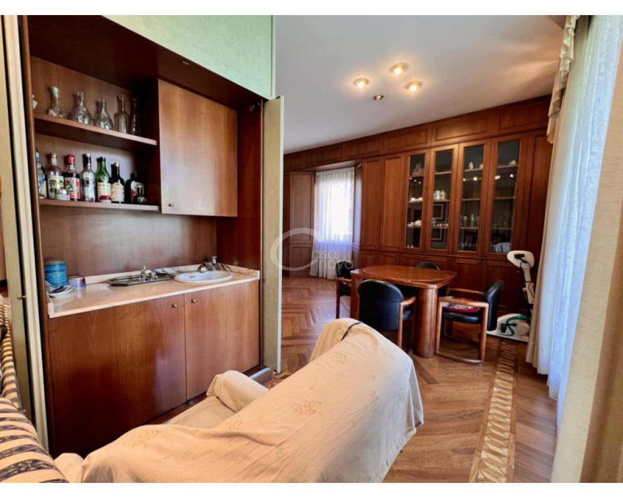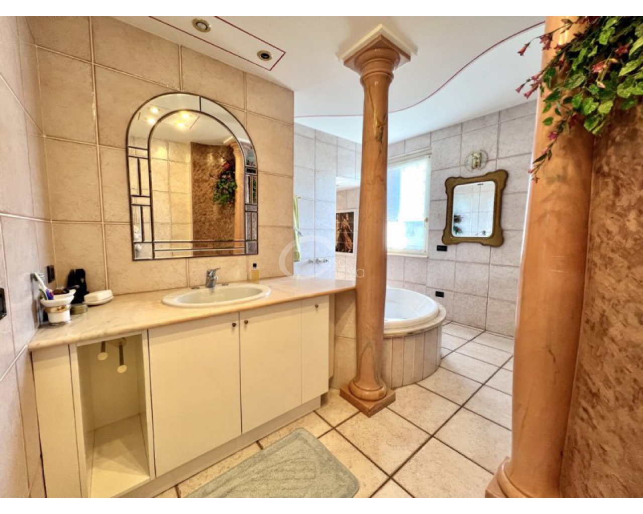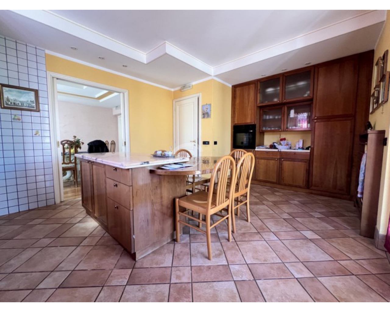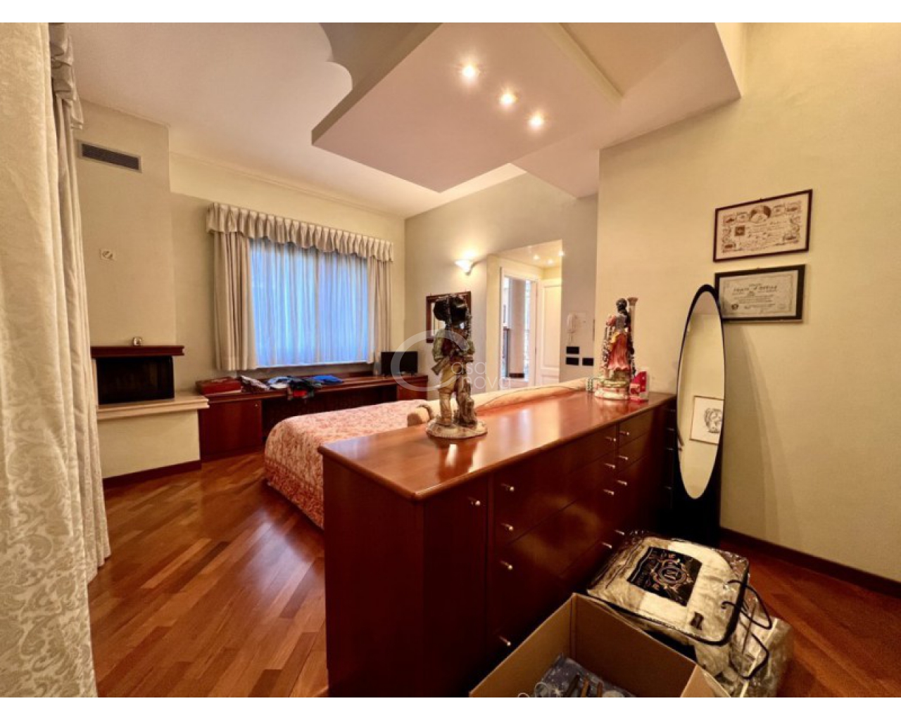 L’ingresso introduce in un suggestivo atrio a doppia altezza, autentico cuore scenografico della casa, valorizzato da una maestosa scala in marmo e ringhiere lavorate, che conduce ai livelli superiori. La luminosità naturale, amplificata dalle ampie vetrate e dal lucernario, esalta le finiture di pregio e il parquet posato a disegno, creando un’atmosfera raffinata e accogliente.