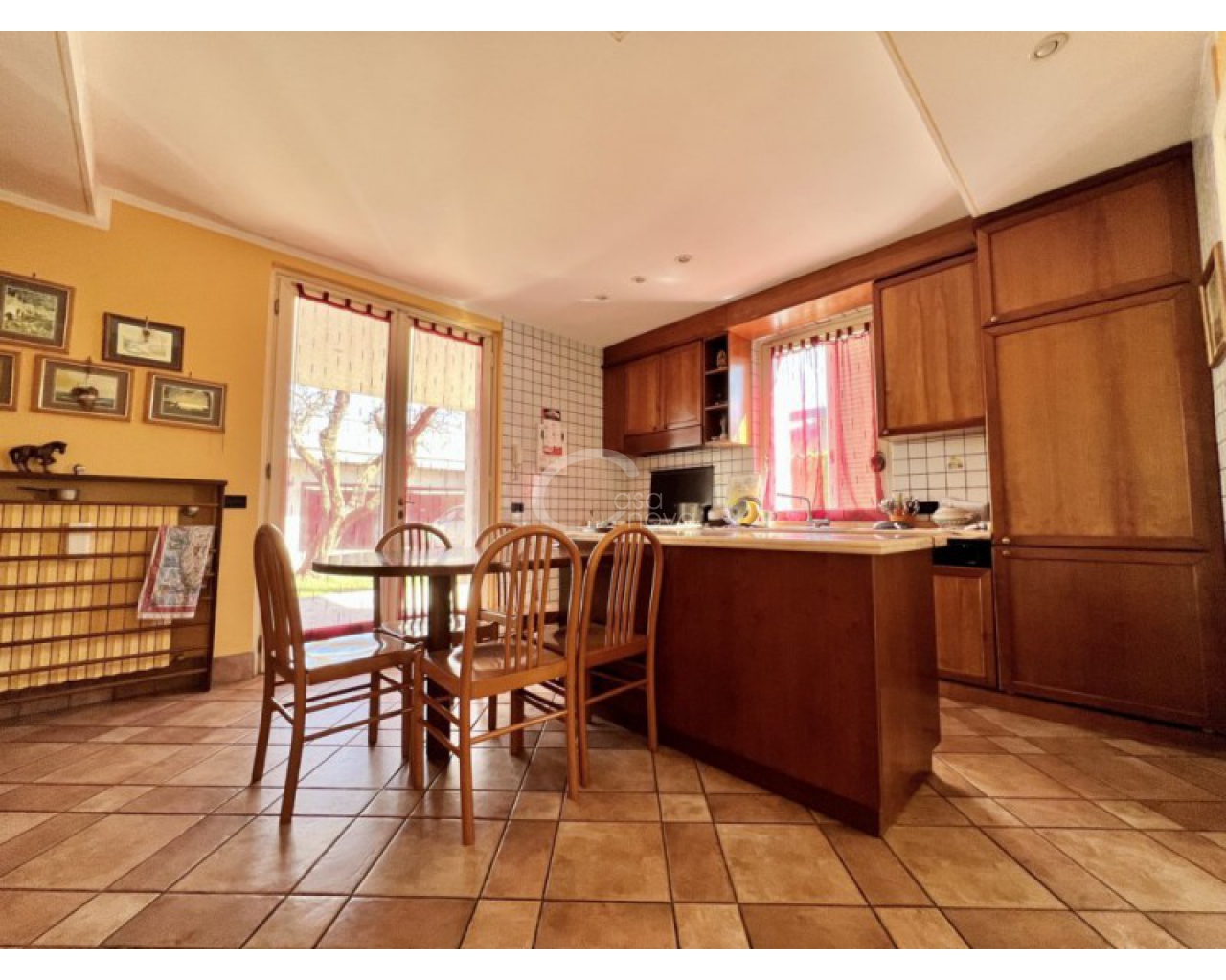 Al piano terra si sviluppa la zona giorno con ambienti ben distinti ma armoniosamente collegati: il soggiorno con camino e angolo bar con accesso al portico, la cucina abitabile anch'essa con accesso al portico ideale per pranzi e cene all'aperto, due locali adibiti a camera per gli ospiti e studio. Completano il piano un bagno finestrato e comoda lavanderia.